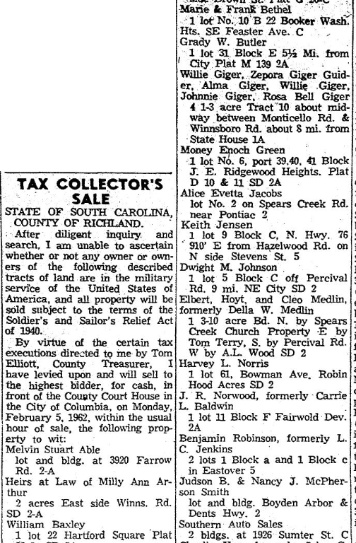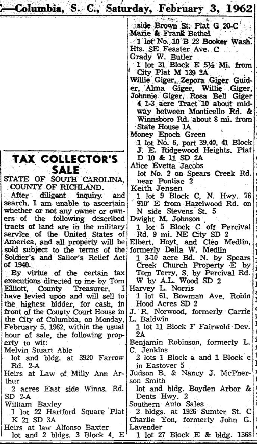 By virtue of the certain tax executions directed to me by Tom Elliott, County Treasurer. I have levied upon and will sell to the highest bidder, for cash, in front of the County Court House in the City of Columbia, on Monday February 5, 1962, within the usual hour, of sale, the following property to wit: