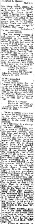 State of South Carolina, County of Richland.IN THE COURT OF COMMON PLEASMargaret L. Garrett, Plaintiff,– vs –Mrs. Gary Jacobs, Horace T. Jacobs, Mrs. Horace T. Jacobs, A. L. Jacobs, Sr., Mrs. A. L. Jacobs, Sr., Evetta Jacobs, Wilton T Jacobs, Mrs. Naomi Jacobs, Master Sergeant Hazel O. Jacobs, Mrs. Hazel O. Jacobs, Otto Jacobs, Mrs. Otto Jacobs, Mrs. H. M. Lippard, Evelyn Riddle and Mike … Continue reading SUMMONS