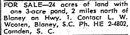 FOR SALE – 24 acres of land with one 3-acre pond, 2 miles north of Blaney on Hwy. 1, Contact L. W. Wooten, Blaney, S. C. Ph. HE 2-4802, Camden, S. C.