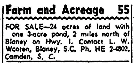 FOR SALE – 24 acres of land with one 3-acre pond, 2 miles north of Blaney on Hwy. 1, Contact L. W. Wooten, Blaney, S. C. Ph. HE 2-4802, Camden, S. C.