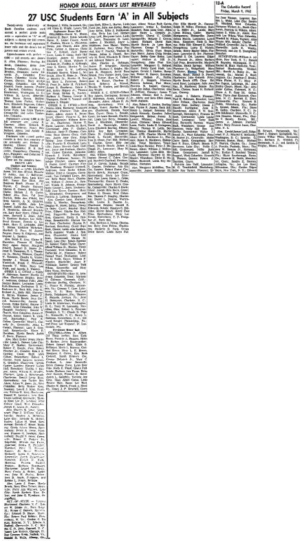 Upperclassmen with perfect — 6,000 – fall records are: James K. Allen, Florence; Sterling Ed Beale, Columbia; Betty Jane Brandon, Columbia; Jeffrey Z. Brooker, Denmark; Leslie Edwards Jr., Columbia; Pixie Foster, Columbia; Elaine Bury Gaston, Chester; Mary Evelyn George, Columbia; Ann WIllis Haskell, North Augusta; Pauline C. Hatchell, Columbia; Suzanne Kronheimer, Washington, D. C.; WIlliam M. Leach, Abbeville; Elke Maria Maron, Mullins; Thomas Leon Parker, Walterboro; Elizabeth Rogerson, Columbia; Edward D. Skinner Jr., Great Falls; Lou Eilyn Thomas, Cottageville; and Helen Timberlake, Columbia.