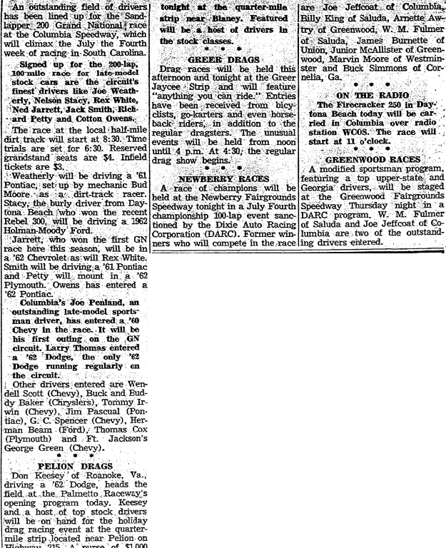 Other drivers entered are Wendell Scott (Chevy), Buck and Buddy Baker (Chryslers), Tommy Irwin (Chevy), Jim Pascual (Pontiac), G. C. Spencer (Chevy), Herman Beam (Ford), Thomas Cox (Plymouth) and Ft. Jackson’s George Green (Chevy).