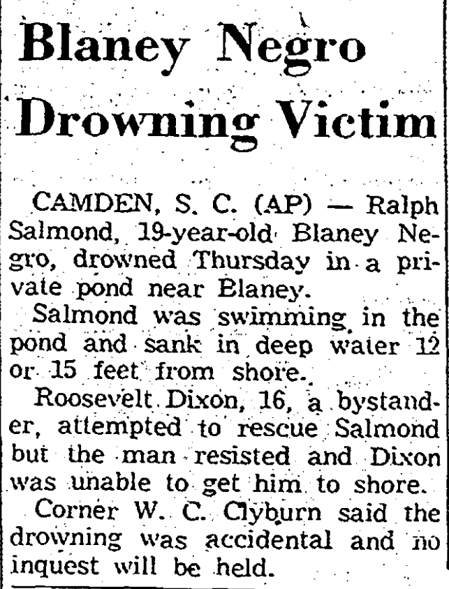 CAMDEN, S. C. (AP) – Ralph Salmond, 19-year-old Blaney Negro, drowned Thursday in a private pond near Blaney.