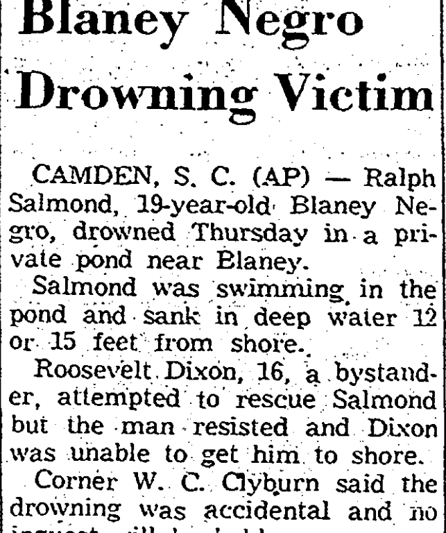 CAMDEN, S. C. (AP) – Ralph Salmond, 19-year-old Blaney Negro, drowned Thursday in a private pond near Blaney.