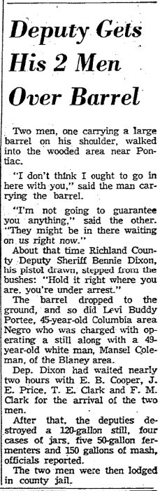 The barrel dropped to the ground, and so did Levi Buddy Portee, 45-year-old Columbia area Negro who was charged with operating a still along with a 49-year-old white man, Mansel Coleman, of the Blaney area.