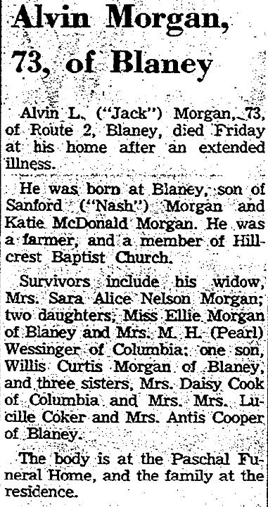 Survivors include his widow, Mrs. Sarah Alice Nelson Morgan; two daughters, Miss Ellie Morgan of Blaney and Mrs. M. H. Wessigner (Pearl) of Columbia; one son, Willis Curtis Morgan of Blaney and three sisters, Mrs. Daisy Cook of Columbia and Mrs. Lucille Coker and Mrs. Antis Cooper of Blaney.