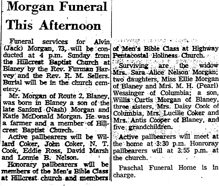 Funeral Services for Alvin (Jack) Morgan will be conducted at 4 p.m. Sunday, from the Hillcrest Baptist Church at Blaney by the Rev. Furman Harvey and the Rev. R. M. Sellers. Burial will be in the church cemetery.
