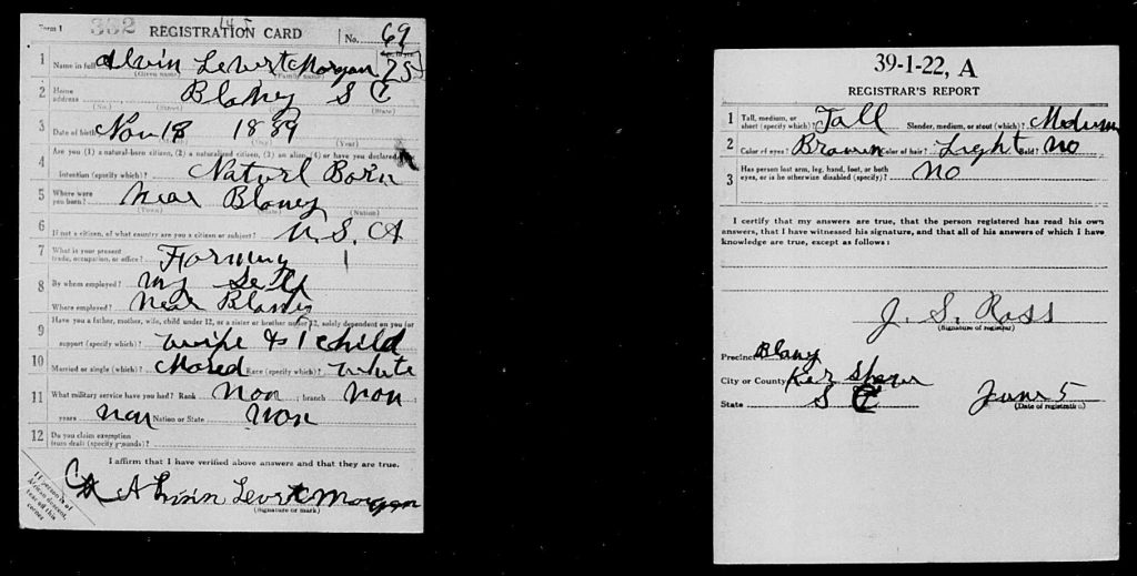 On June 5, 1917, Alvin Levert Morgan completed his United States World War I Draft Registration Cards.