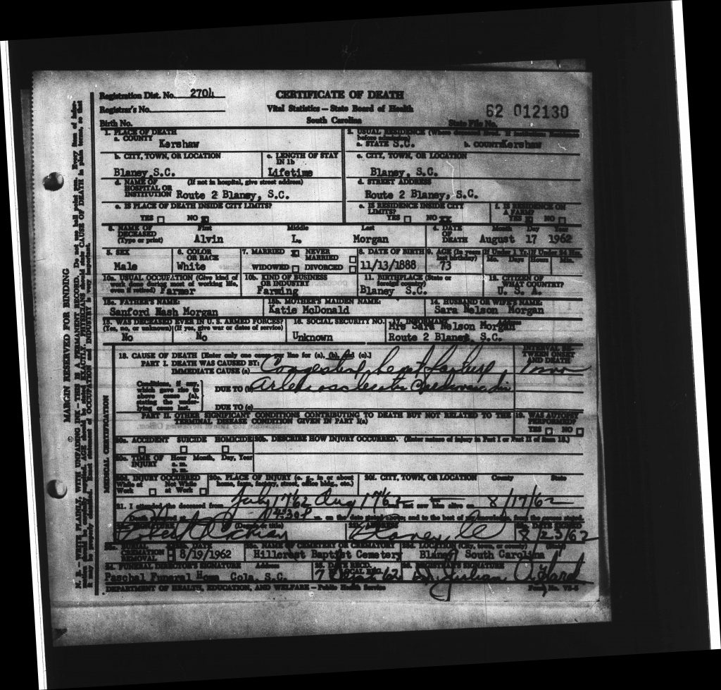 Alvin Levert “Jack” Morgan died on 17 Aug 1962 in Elgin, Kershaw, South Carolina, USA. He was buried on 19 Aug 1962 in Elgin, Kershaw, South Carolina, USA at Hillcrest Baptist Church Cemetery. His cause of death was congestive heart failure.