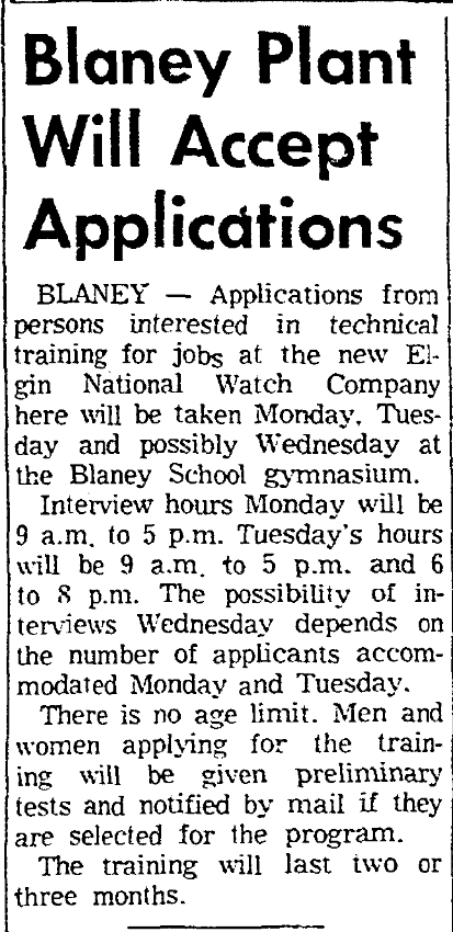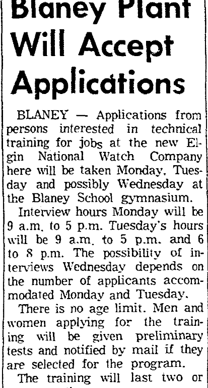 BLANEY – Applications from persons interested in technical training for jobs at the new Elgin National Watch Company here will be taken Monday, Tuesday and possibly Wednesday at the Blaney School gymnasium.