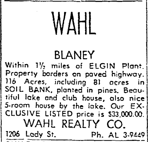With 1 1/2 miles of ELGIN Plant. Property borders on paved highway. 116 Acres, including 81 acres in SOIL BANK, planted in pines. Beautiful lake and club house, also nice 5 room house by the lake. OUr EXCLUSIVE LISTED price is $33,000.00