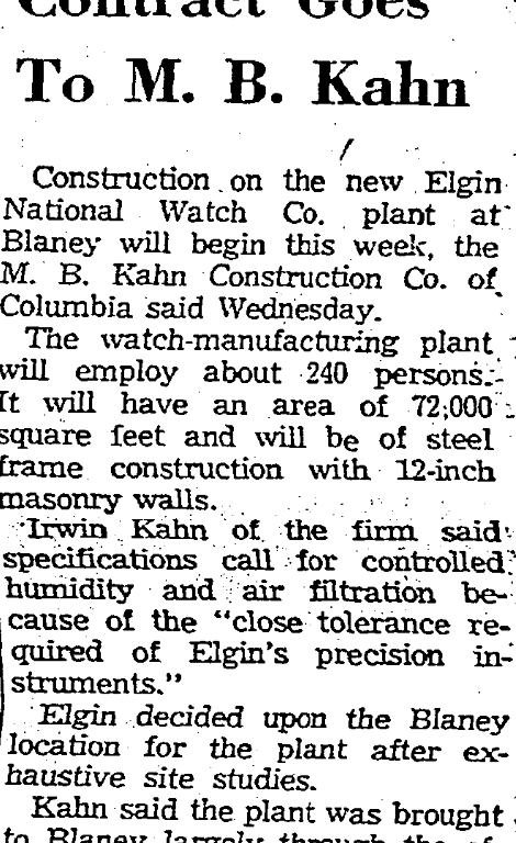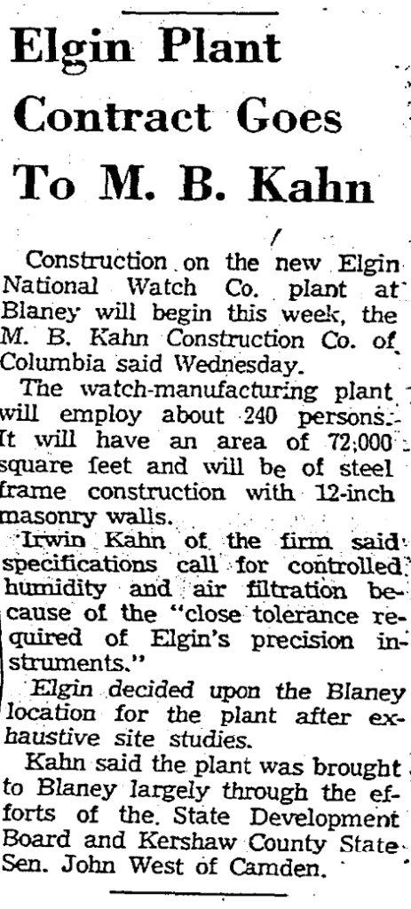 Kahn said the plant was brought to Blaney largely through the efforts of the State Development Board and Kershaw County State Sen. John West of Camden.