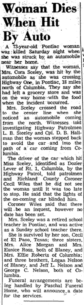 The driver of the car which hit Miss Sceley, identified as Dozier Lever of Rt. 1, Columbia, by the Highway Patrol, told patrolmen and Richland County Coroner Ceil Wiles that he did not see the woman until it was too late to stop. He said that the lights of the on-coming car blinded him.