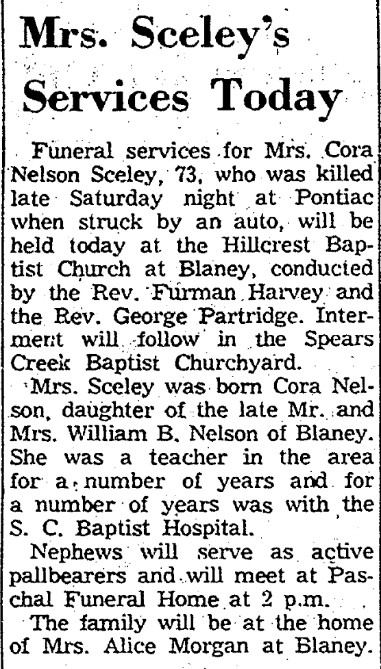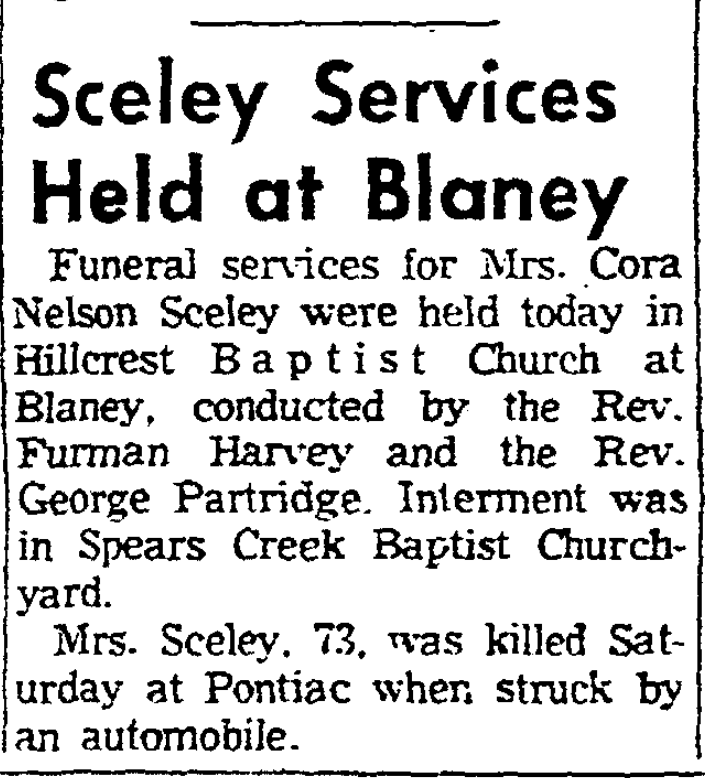 Funeral services for Mrs. Cora Nelson Sceley were held today in Hillcrest Baptist Church at Blaney, conducted by the Rev. Furman Harvey and the Rev. George Partridge. Interment was in Spears Creek Baptist Churchyard.