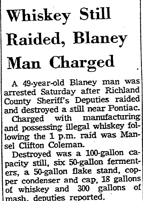 A 49-year-old Blaney man was arrested Saturday after Richland County Sheriff’s Deputies raided and destroyed a still near Pontiac. Charged with manufacturing and possessing illegal whiskey following the 1 p.m. raid was Mansel Clifton Coleman. Destroyed was a 100-gallon capacity still, six 50-gallon fermenters, a 50-gallon flake stand, copper condenser and cap, 18 gallons of whiskey and 300 gallons of mash, deputies reported. Continue reading Whiskey Still Raided, Blaney Man Charged