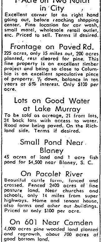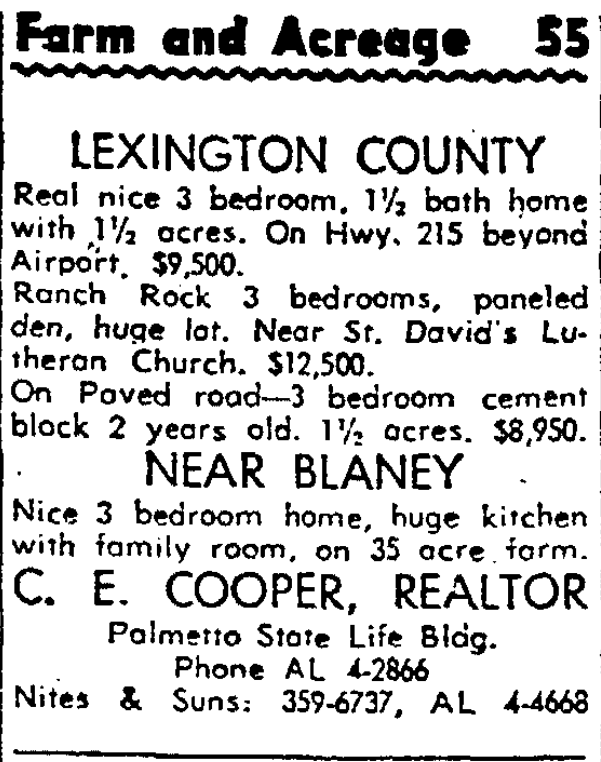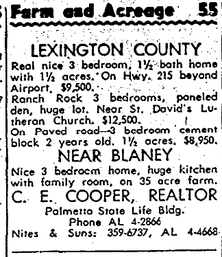 LEXINGTON COUNTY Real nice 3 bedroom, 1 1/2 bath home with 1 1/2 acres. On Hwy. 215 beyond Airport. $9,500. Ranch Rock 3 bedrooms, paneled den, huge lot. Near St. David’s Lutheran Church, $12,500. On Paved Road – 3 bedroom cement block 2 years old. 1 1/2 acres. $8,950. NEAR BLANEY Nice 3 bedroom home, huge kitchen with family room, on 35 acre farm. C. … Continue reading Farm and Acreage