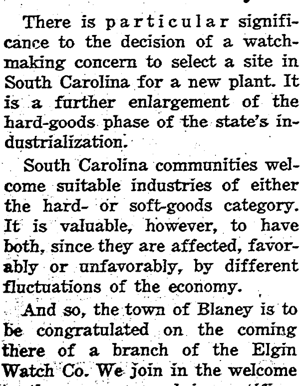 There is particular significance to the decision of a watch-making concern to select a site in South Carolina for a new plant. It is a further enlargement of the hard-goods phase of the state’s industrialization. South Carolina communities welcome suitable industries of either the hard -or soft-goods category. It is valuable, however, to have both, since they are affected, favorably or unfavorably, by different fluctuations … Continue reading Varied Industry