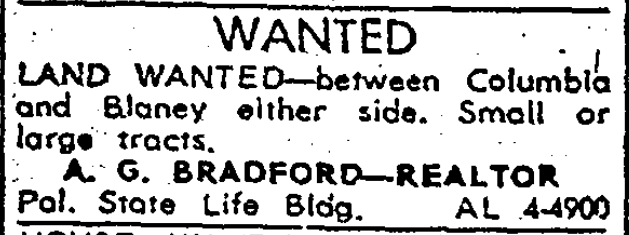 LAND WANTED – between Columbia and Blaney either side. Small or large tracts. A. G. Bradford – Realtor Pal. Sate Life Bldg. AL 4-4900 Continue reading Real Estate Wanted
