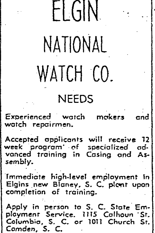 Immediate high-level employment in Elgin’s New Blaney, S. C. plant upon completion of training.