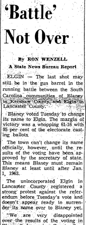 ELGIN- The last shot may still be in the gun barrel in the running battle between the South Carolina communities of Blaney in Kershaw County and Elgin in Lancaster County.