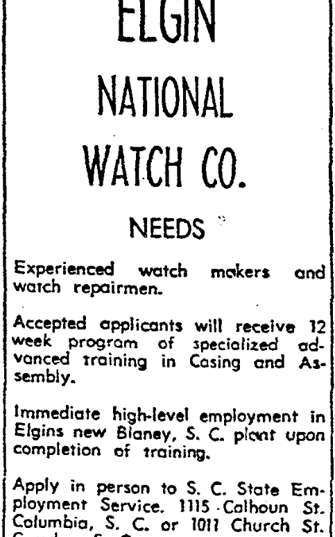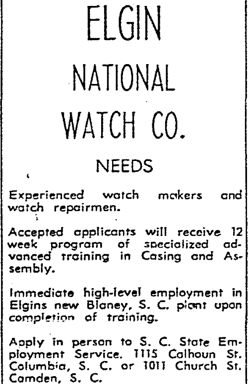 ELGIN NATION WATCH CO. NEEDS Experienced watch makers and watch repairmen. Accepted applicants will receive 12 week program of specialized advance training in casing and Assembly. Immediate high-level employment in Elgin’s New Blaney, S. C. plant upon completion of training. Apply in person to S. C. State Employment Service. 1115 Calhoun St. Columbia, S. C. or 1011 Church St. Camden, S. C. Continue reading Male Help Wanted