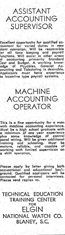 This is a fine opportunity for a man with machine accounting experience. Must be a high school graduate with a minimum of one year experience plus some knowledge of control panel wiring. Will be given additional training and schooling. Must be mature, reliable, and capable of working with limited supervision on a shift operation.