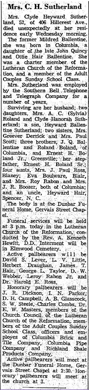 Surviving are her husband; two daughters, Mrs. A. C. Roland (Sylvia) and Clyde Hanorah Sutherland; a son, Heyward Ballentine Sutherland; two sisters, Mrs. Greever Derrick and Mrs. Paul Scott; three brothers, J. Q. Ballentine and Roland Boland, of Columbia, and Ernest H. Boland Jr., Greenville; her stepfather, Ernest H. Boland Sr.; four aunts, Mrs. J. Paul Ross, Blaney; Eva Boulware, Blair, and Mrs. Roy Rabon and Mrs. J. R. Boozer, both of Columbia; and an uncle, Heyward Hair, Spencer, N. C.