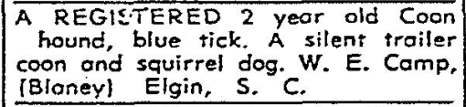 A REGISTERED 2 year old Coon hound, blue tick. A silent trailer coon and squirrel dog. W. E. Camp, (Blaney) Elgin, S. C.