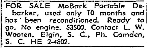 FOR SALE McBark Portable Debarker, used only 10 months and has been reconditioned. Ready to go. No engine. $3500. Contact L. W. Wooten, Elgin, S. C., Ph. Camden, S.C. HE 2-4802