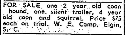 FOR SALE one 2 year old coon hound, one silent trailer, 4 year old coon and squirrel. Price $75 each on trial. W. E. Camp, Elgin, S. C.