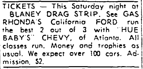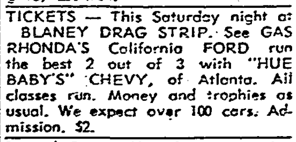 TICKETS – This Saturday night at BLANEY DRAG STRIP. See GAS RHONDA’S California FORD run the best 2 out of 3 with “HUE BABY’S” CHEVY, of Atlanta. All classes run. Money and trophies as usual. We expect over 100 cars. Admission, $2. Continue reading For Sale Miscel’ous