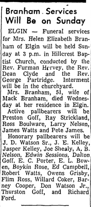 ELGIN – Funeral services for Mrs. Helen Elizabeth Branham of Elgin will be held Sunday at 3 p.m. in Hillcrest Baptist Church, conducted by the Rev. Furman Harvey, the Rev. Dean Clyde and the Rev. George Patridge. Interment was in the churchyard.