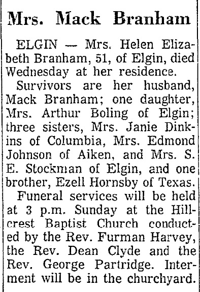 Survivors are her husband, Mack Ausman Branham; one daughter, Mrs. Arthur Boling of Elgin; three sisters, Mrs. Janie Dinkins of Columbia, Mrs. Edmond Johnson of Aiken, and Mrs. S. E. Stockman of Elgin, and one brother, Ezell Hornsby of Texas.