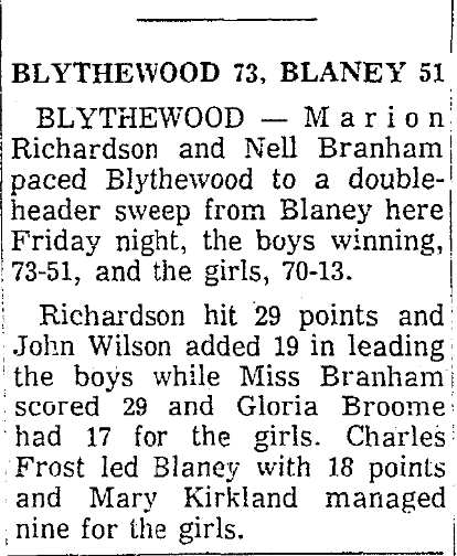 BLYTHEWOOD – Marion Richardson and Nell Branham paced Blythewood to a doubleheader sweep from Blaney here Friday night, the boys winning, 73-51, and the girls, 70-13.