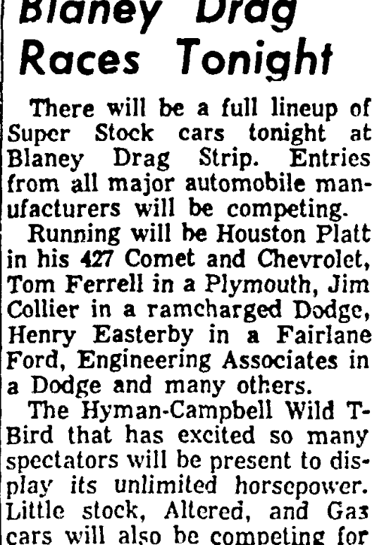 The Blaney Dragstrip will feature a new entry in the world of drag-racing tonight. Running for the first time in the entire southeast will be “Geronimo,” a Pontiac Tempest engineered and owned by the notorious Hubert Platt. This dynamic piece of machinery will be running against Big Tom Ferrel’s four-speed Plymouth, Jim Collier’s ramcharged Dodge, Henry Easterby’s 427 Fairlane Ford and Engineering Associates’ 426 automatic … Continue reading ‘Geronimo’ Will Run at Blaney