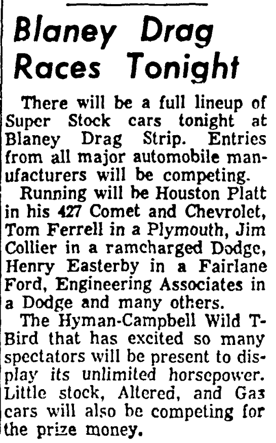 Running will be Houston Platt in his 427 Comet and Chevrolet, Tom Ferrell in a Plymouth, Jim Collier in a ramcharged Dodge, Henry Easterby in a Fairlane Ford, Engineering Associates in a Dodge and many others.