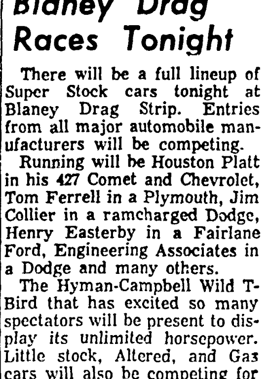 Running will be Houston Platt in his 427 Comet and Chevrolet, Tom Ferrell in a Plymouth, Jim Collier in a ramcharged Dodge, Henry Easterby in a Fairlane Ford, Engineering Associates in a Dodge and many others.