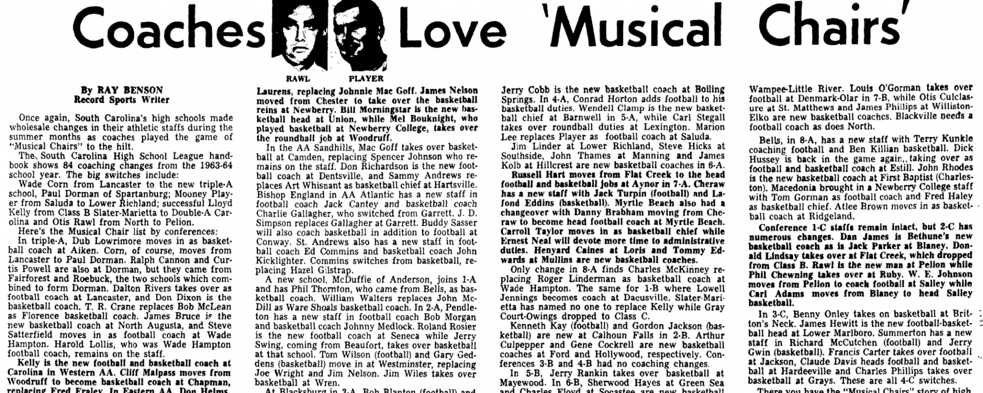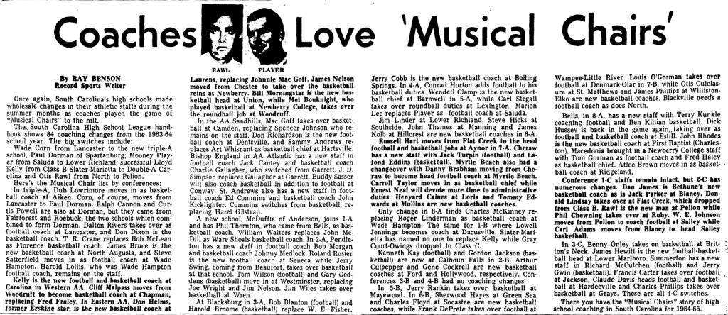 There you have the “Musical Chairs” story of high school coaching in South Carolina for 1964-65.
