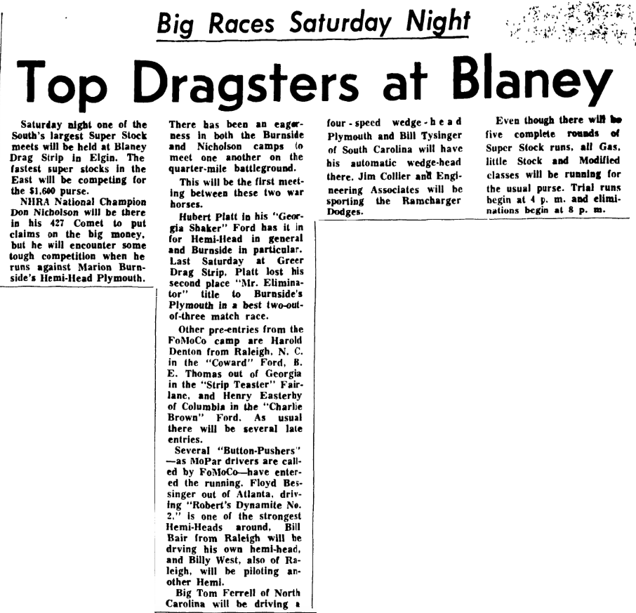 Big Tom Ferrell of North Carolina will be driving a four-speed wedge-head Plymouth and Bill Tysinger of South Carolina will have his automatic wedge-head there. Jim Collier and Engineering Associates will be sporting the Ramcharger Dodges.