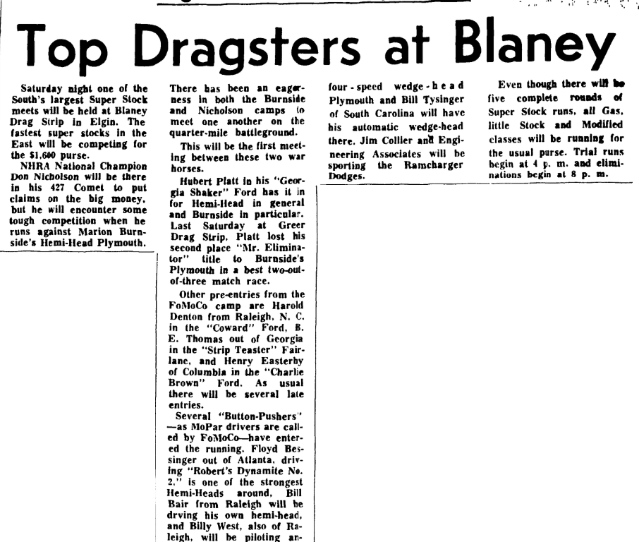 Big Tom Ferrell of North Carolina will be driving a four-speed wedge-head Plymouth and Bill Tysinger of South Carolina will have his automatic wedge-head there. Jim Collier and Engineering Associates will be sporting the Ramcharger Dodges.