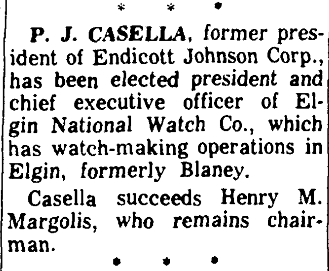 P. J. CASELLA, former president of Endicott Johnson Corp., has been elected president and chief executive officer of Elgin National Watch Co., which has watch-making operations in Elgin, formerly Blaney.