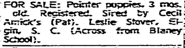 FOR SALE – Pointer puppies, 11 weeks old, registered, sired by Cecil Amick’s “Pat.” Leslie Stover, Elgin, S. C. (across from Blaney School).