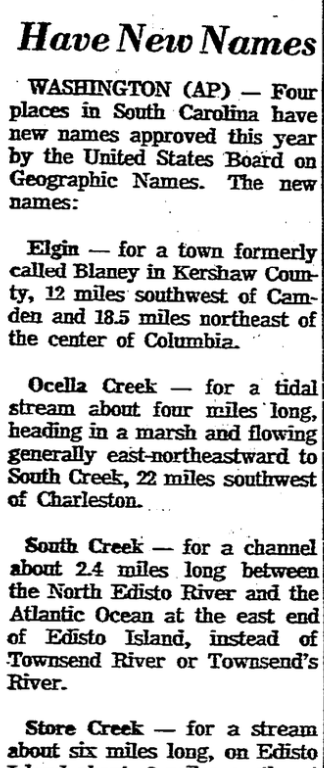 WASHINGTON (AP) – Four places in South Carolina have new names approved this year by the United States Board on Geographic Names. The new names: