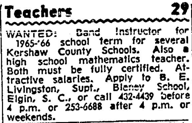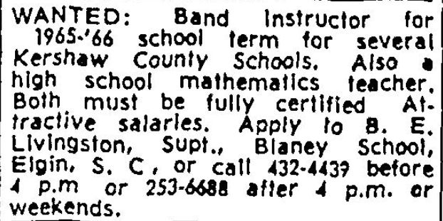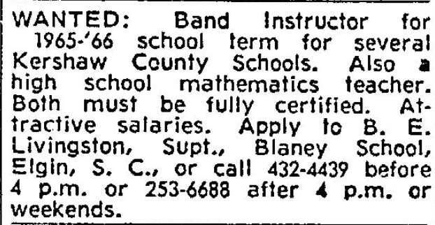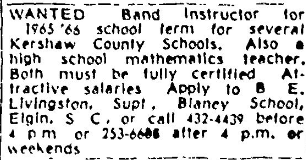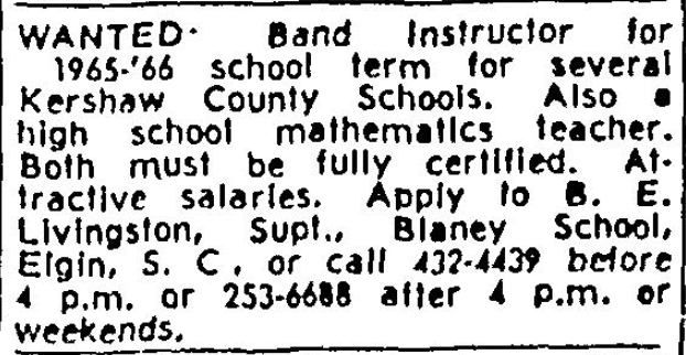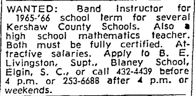 WANTED band instructor for 1965-66 school term for several Kershaw County Schools. Must be fully certified, attractive salary to right person. Apply to B. E. Livingston, Supt., Blaney School, Elgin, S.C. or call 432-4439 before 4 p.m. or 253-6688 after 4 p.m. or weekends. Continue reading Teachers 29