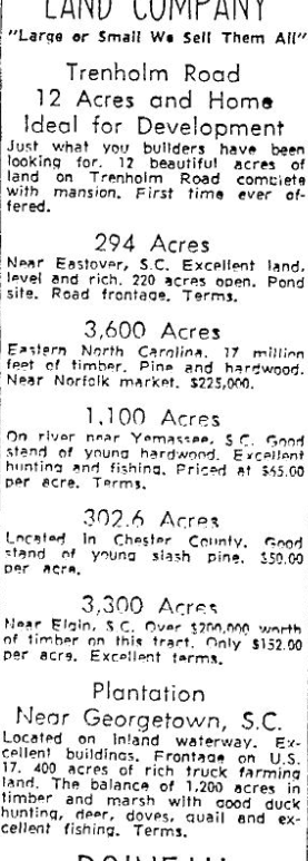 BOINEAU LAND COMPANY “Large or Small We Sell Them All” Trenholm Road 12 Acres and Home Ideal for Development Just what you builders have been looking for. 12 beautiful acres of land on Trenholm Road complete with mansion. First time ever offered. 294 AcresNear Eastover, S.C. Excellent land, level and rich. 220 acres open. Pond site. Road frontage. Terms. 3,600 AcresEastern North Carolina. 17 million … Continue reading Farm and Acreage 93