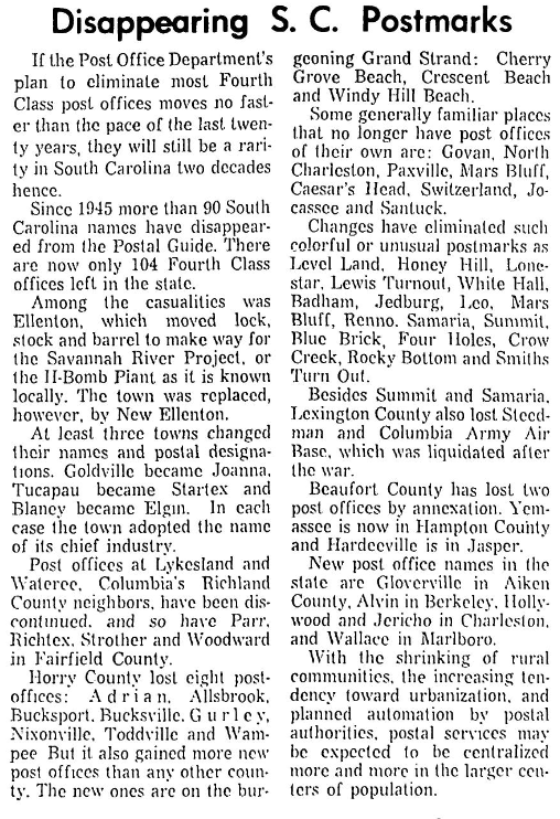 If the Post Office Department’s plan to climinale most Fourth Class post offices moves no faster than the pace of the last twenty years, they will still be a rarity in South Carolina two decades hence. Since 1945 more than 90 South Carolina names have disappeared from the Postal Guide. There are now only 104 Fourth Class offices left in the state. Among the causalities … Continue reading Disappearing S. C. Postmarks