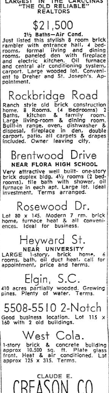 CLAUDE E. CREASON CO.LARGEST IN THE CAROLINAS“THE OLD RELIABLE” REALTORS $21,5002½ Baths – Air Cond.Just listed this stylish 8 room brick rambler with entrance hall, 4 bedrooms, formal living and dining rooms, paneled den with fireplace and electric kitchen. Oil furnace and central air conditioning system, carport. Large wooded lot. Convenient to Dreher and St. Joseph’s. Appointment. Rockbridge RoadRanch style old brick construction home. 8 … Continue reading Homes for Sale 90