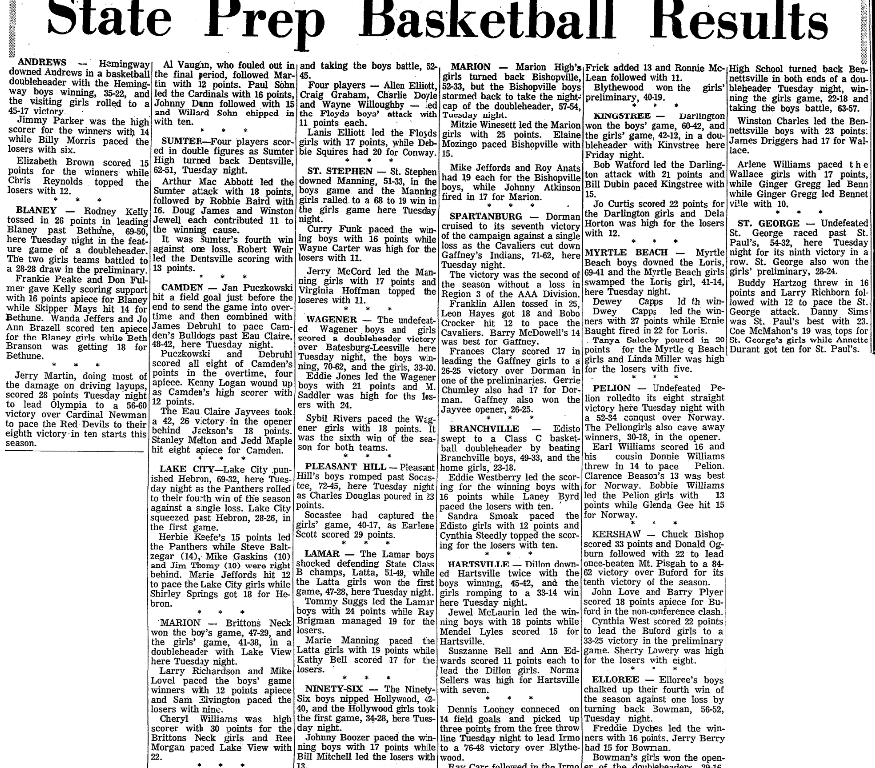Frankie Peake and Don Fulmer gave Kelly scoring support with 16 points apiece for Blaney while Skipper Mays hit 14 for Bethune. Wanda Jeffers and Jo Ann Brazell scored ten apiece for the Blaney girls while Beth Branson was getting 18 for Bethune.