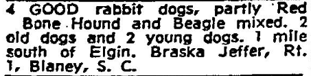 4 GOOD rabbit dogs, partly Red Bone Hound and Beagle mixed. 2 old dogs and 2 young dogs. 1 miles south of Elgin. Braska Jeffer, Rt. 1, Blaney, S. C.