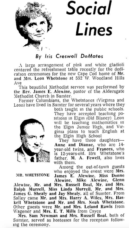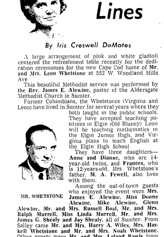 Former Columbians, the Whetstones (Virginia and Leon) have lived in Sumter for several years where they both taught in the public schools. They have accepted teaching positions in Elgin (Old Blaney) Leon will be teaching mathematics in the Elgin Junior High, and Virginia plans to teach English at the Elgin High School.
